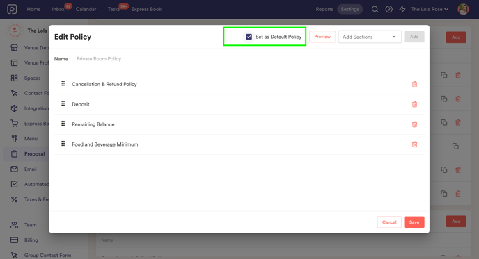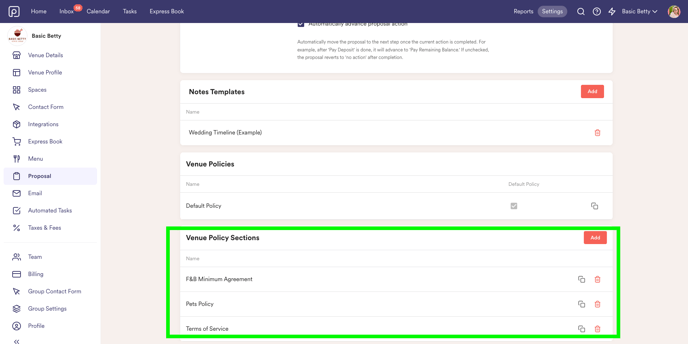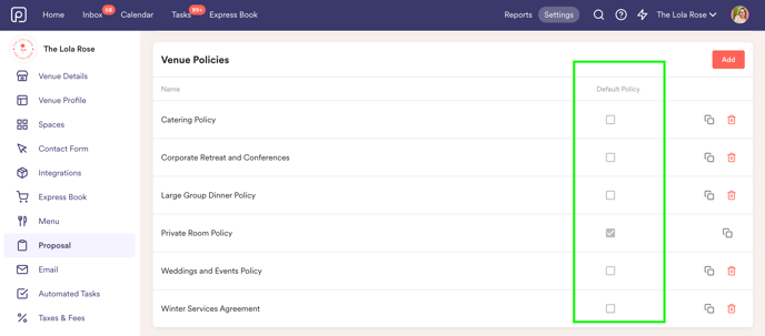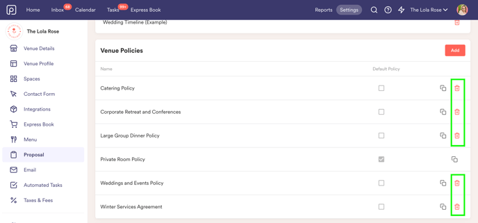 Once again, head to Settings → Proposal Settings, and scroll to "Venue Policies". You can delete the policy here, but note that you can't delete your default policy.