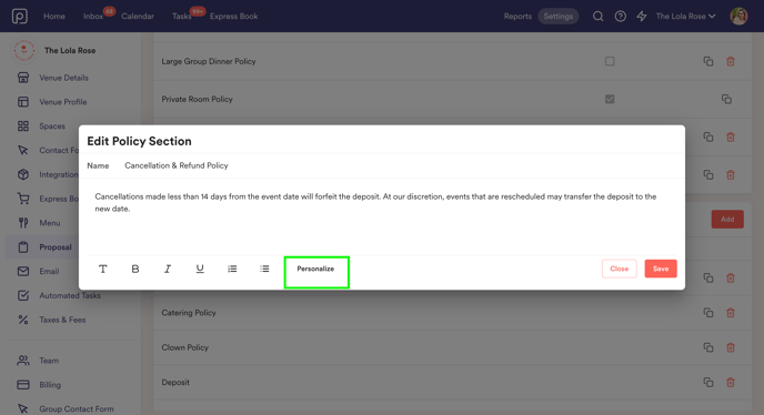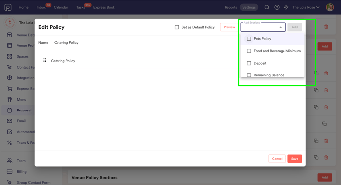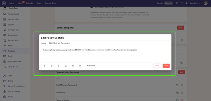Policies are agreements for your business, made up of policy sections. Guests will see the policy on any Proposals you send to them.